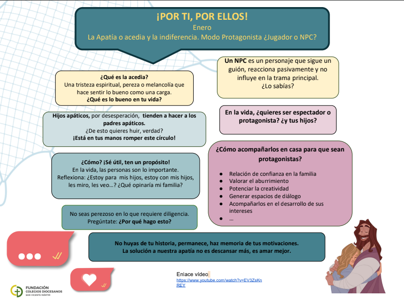 Os invitamos a leer y compartir en familia la infografía del mes de enero dentro de nuestro proyecto “¡POR TI, POR ELLOS!”: “La apatía o acedia y la indiferencia. ¿Modo protagonista: jugador o NPC?”.